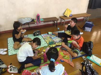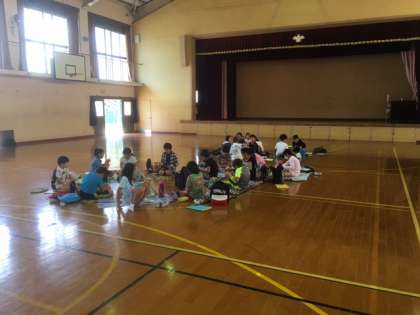 雨で外で昼ごはんを食べることができません。生き方探究館の体育館で,ランチタイムです。