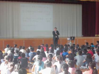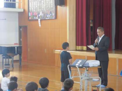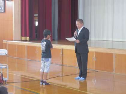 前期終業式が行われました。前期の学校生活をしっかり振り返り,また後期から新たな目標に向かって頑張ってほしいと思います。式終了後には,支部の相撲大会と作品展の表彰がありました。