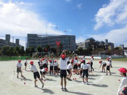 レインボー玉入れの練習を行っています。