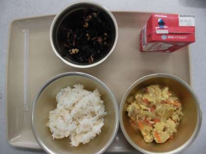 今日の給食の献立は,「玄米ご飯」「親子煮」「牛乳」「ひじきまめ」です。