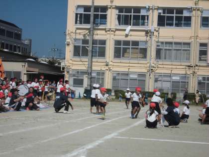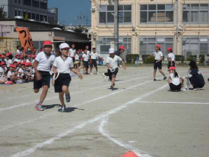 赤白対抗リレー(1〜3年生)です。みんな一生懸命に走っていました。