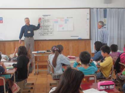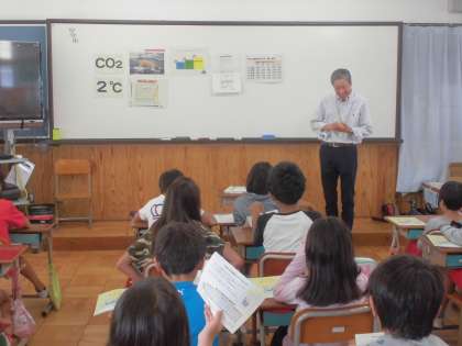 気候ネットワークの方々に来ていただき,4年生と5年生で第2回エコライフチャレンジ(環境学習)が行われました。まずは前回のエコライフチャレンジで学習した,地球温暖化の仕組みや環境にやさしい生活についてもう1度おさらいしました。