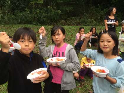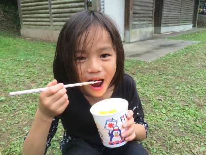 お昼ご飯は,カレーライスです。デザートはかき氷です。