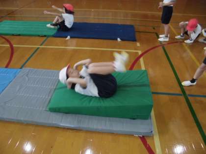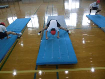 体育の時間に,「マット」を学習しています。今日は,自分の挑戦したい技を練習していました。