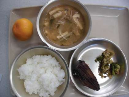今日の給食の献立は,「ご飯」「九条ネギの味噌汁」「にしんの煮付け」「ブロッコリーのおかか煮」「みかん」です。