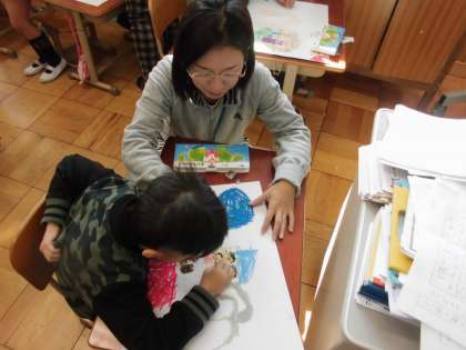 図画工作の時間に,「のってみたいな いきたいな」を学習しています。今日は,素敵な乗り物になるように色をぬっていました。