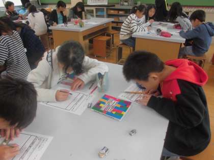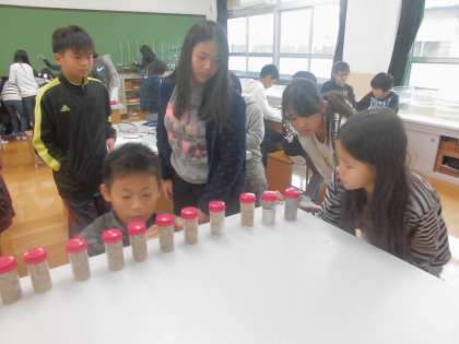 ボーリング試料を使って学校の地下の様子を調べました。深さごとに記録をとることで,深さによってつぶの大きさや色に違いがあることに気が付きました。