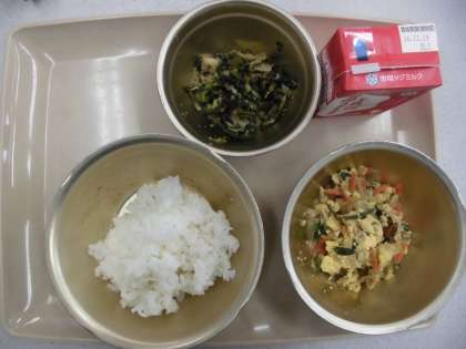 今日の給食の献立は,「ご飯」「あげたまに」「牛乳」「ほうれん草と白菜の胡麻煮」です。