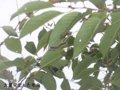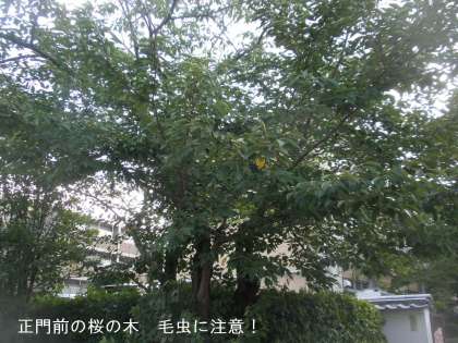 正門前や東門の桜の木に,毛虫が大量発生して困っています。葉を食べられ,地面には毛虫の糞がいっぱいです。学校だけでなく地域の桜を見に行きましたが,どこの桜も毛虫が発生しています。土日に殺虫剤を散布する予定ですが,桜の木の下を通る時は注意してくださいね。