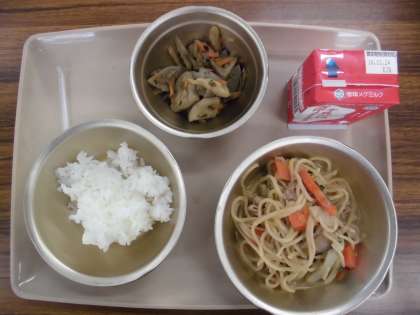 今日の給食の献立は,「ご飯」「五目ラーメン」「牛乳」「根菜のピリカラ炒め」です。