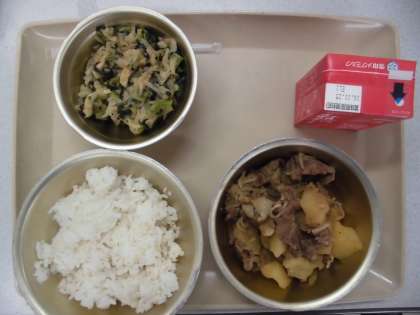 今日の給食の献立は,「麦ご飯」「肉じゃが」「牛乳」「小松菜と切干し大根のにびたし」です。