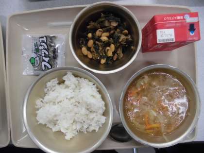 今日の給食の献立は,「麦ご飯」「キャベツの吉野汁」「牛乳」「肉味噌炒め」「じゃこ」です。