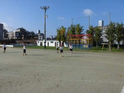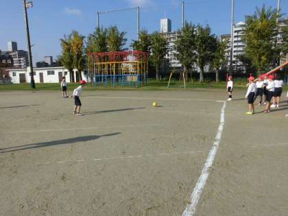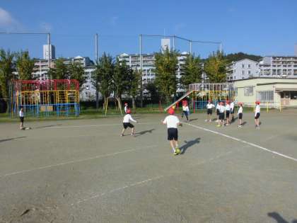 体育の時間に,「キックベース」を学習しています。今日は,ゲームの進め方について学習していました。