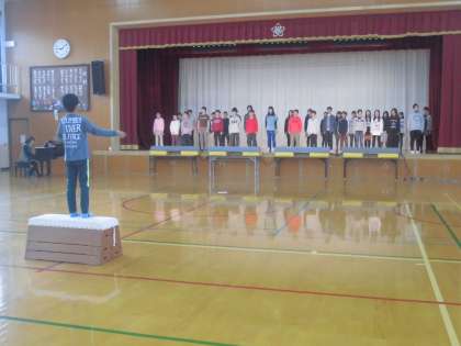 音楽の時間に,学習発表会で歌う歌の練習を体育館で行いました。体育館でもとてもきれいな歌声が響くようになってきました。本番が楽しみです。