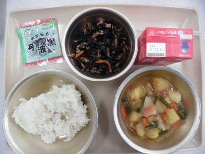 今日の給食の献立は,「麦ご飯」「鶏肉と野菜の煮付け」「牛乳」「ひじきの煮つけ」「黒大豆」です。
