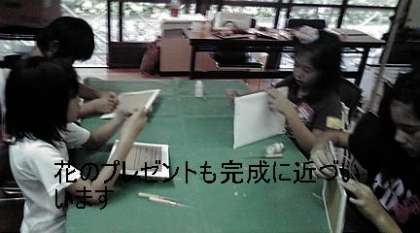 壁に掛ける用のひもを通して、花のプレゼントも完成に近づいています。