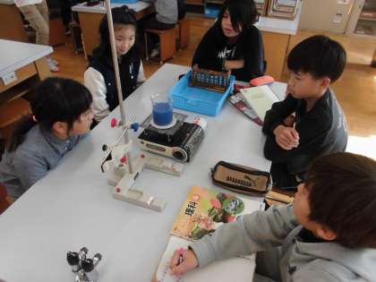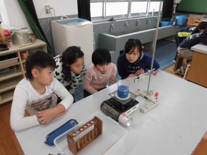 理科の時間に「もののあたたまり方」を学習しています。今日は,水のあたたまり方について学習していました。