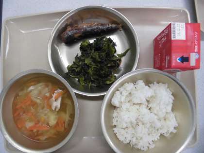 今日の給食の献立は,「麦ご飯」「キャベツの吉野汁」「牛乳」「いわしのかわり煮」「ほうれん草のおかか煮」です。