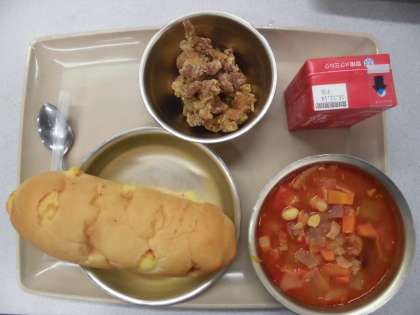 今日の給食の献立は,「チーズコッペパン」「ミネストローネ」「牛乳」「スパイシーチキン」です。