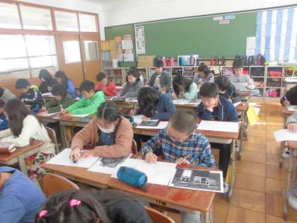 版画の学習が始まりました。5年生は多色木版画に挑戦するようです。今日は集中して下絵に取り組んでいました。