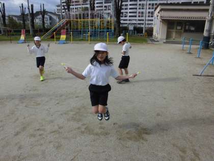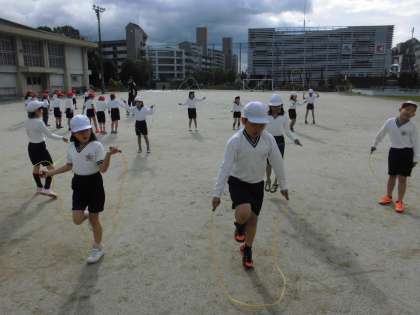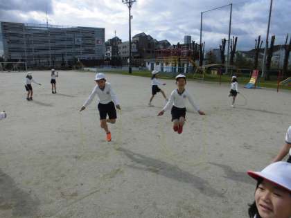 体育の時間に,「なわとび」の練習をしていました。一生懸命になわとび練習を行っていました。