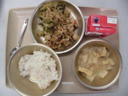 今日の給食の献立は,「麦ご飯」「アスパラガスのおかかに」「とりめしのぐ」「牛乳」「かぶらとおあげのたいたん」です。