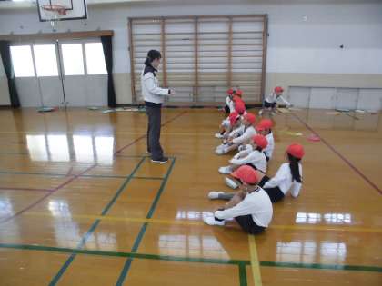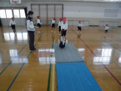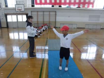 体育の時間に,「マット運動」を学習しています。今日は,実技テストをしていました。