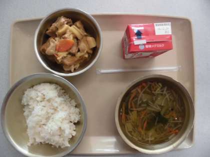 今日の給食の献立は,「麦ご飯」「はるさめスープ」「牛乳」「ジャーツァントウフ」です。
