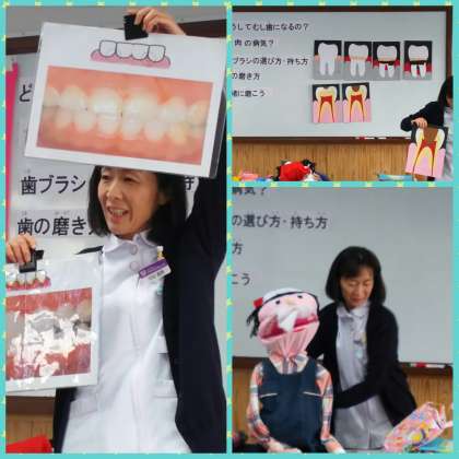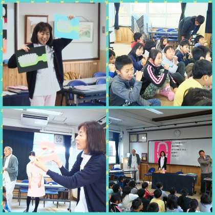 学校歯科医の山本先生や歯科衛生士の矢田先生らが来られ,3年生に歯みがき指導をしてくださいました。『どうしてむし歯になるの?』や『歯肉の病気』について教えてもらった後に,歯みがきをみんなでやってみました。歯ブラシの持ち方や磨き方,うがいのしかたも教えていただきました。磨き方のポイントは『鉛筆持ちで脇をしめて磨くと,ほどよい力で磨くことができる』とアドバイスをいただきました。