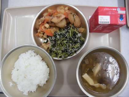 今日の給食の献立は,「ご飯」「ずいきのくずひき」「牛乳」「ひらてんの煮付け」「大根葉とじゃこの炒め物」です。