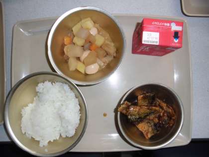 今日の給食の献立は,「ご飯」「秋刀魚のかば焼き」「牛乳」「かんとうに」です。