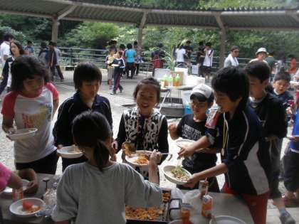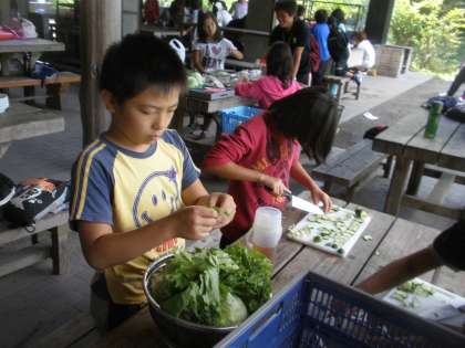 5日目,野外パーティーの準備がはじまりました。各班メニューが違います。「ちらしずし」「かやくご飯おにぎり」「スパゲティー」「フルーツポンチ」「焼き鳥」など10種類のメニューでコンテストします。