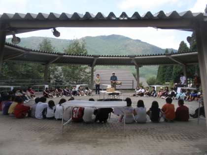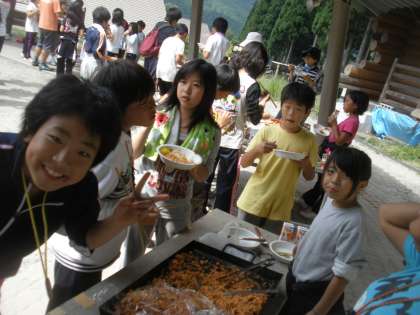 おおいに盛り上った野外パーティーが終りました。これから後始末をがんばり,今夜のメインキャンプファイヤーの練習をします。そして「冒険の森・アスレチック」でフリータイムです。