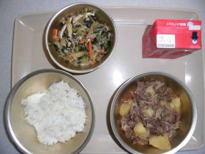 今日の給食の献立は,「麦ご飯」「肉じゃが」「牛乳」「切干し大根の煮付け」です。