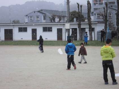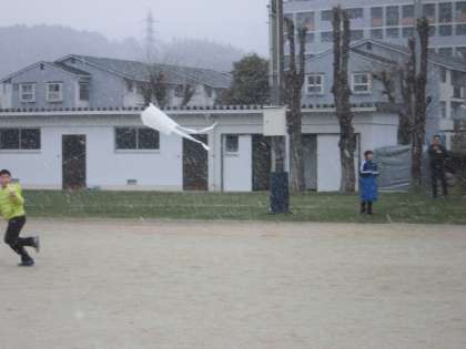 作った凧をさっそくあげています。