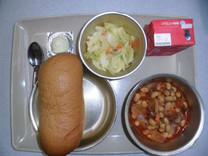 今日の給食の献立は,「黒糖コッペパン」「大豆と牛肉のトマト煮」「牛乳」「野菜のホットマリネ」「かたチーズ」です。