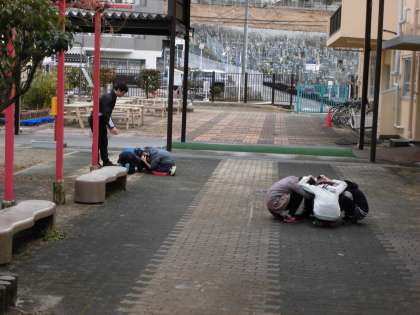 机の下にもぐったり,ガラスがとんでこないところでしゃがんだりと自分で避難する方法を考える訓練でした。低学年の児童には少し難しかったかもしれませんが,みんな真剣に訓練をしていました。