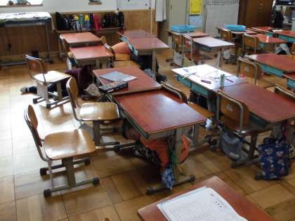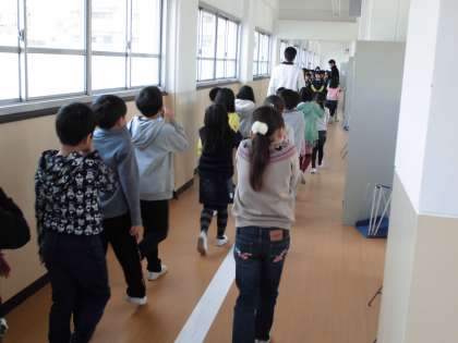 昼休みということで,児童はそれぞれ教室や廊下,トイレ,中庭,図書館など,好きな場所で遊んでいるところに,訓練の放送で地震が発生したことを知らせました。