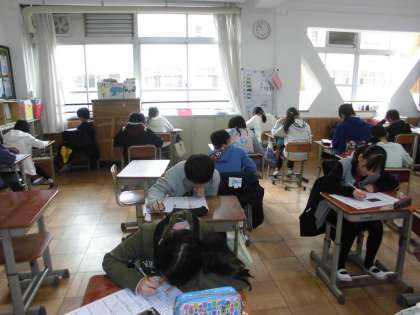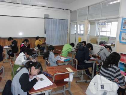 国語の時間に,「柿山伏について」を学習しています。今日は,まとめのテストをしていました。