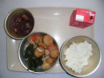 今日の給食の献立は,「麦ご飯」「ほうれん草のおかか煮」「ひらてんとこんにゃくの煮付け」「牛乳」「芋ぜんざい」です。
