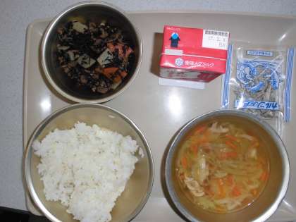 今日の給食の献立は,「麦ご飯」「キャベツの吉野汁」「牛乳」「牛肉とひじきの炒め煮」「じゃこ」です。