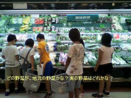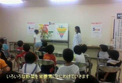 昨日と同じように、グループで体に必要な栄養素を考えながら野菜などの買い物をしたり、食育インストラクターさんによる食べ物の栄養価や食べ方のバランスのお話を聞いたりしました。