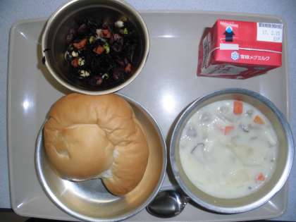 今日の給食の献立は,「バターうずまきパン」「きのこのクリームシチュー」「牛乳」「ひじきのソテー」です。