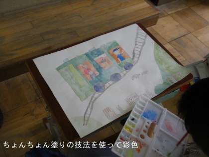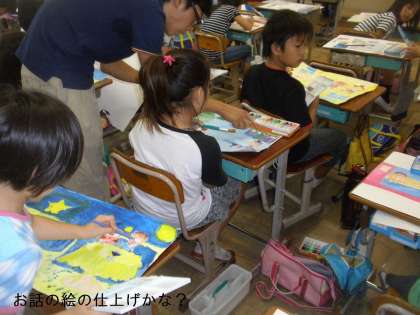 絵の具の塗り方も工夫しています。3年生のこの時期に画用紙に色をおいていく「ちょんちょん塗り」をマスターしています。混色も上手にできてすごくきれいな色を出しています。