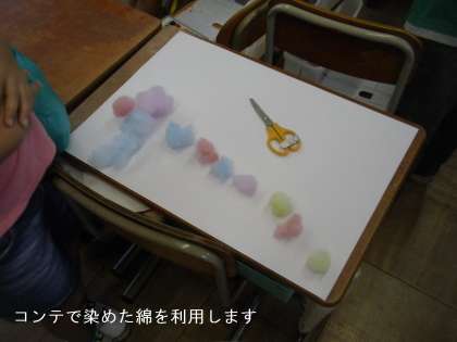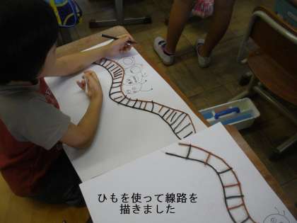 2年生も3年生に負けじと「お話の絵」に取り組んでいます。コンテで綿を染色して画用紙にはったり,ひもを使って線路にしたりと工夫しています。どんな絵になるのか楽しみです。