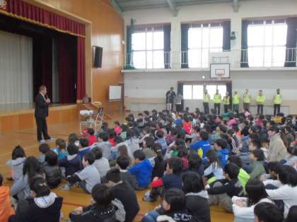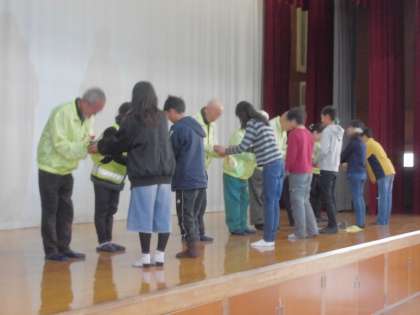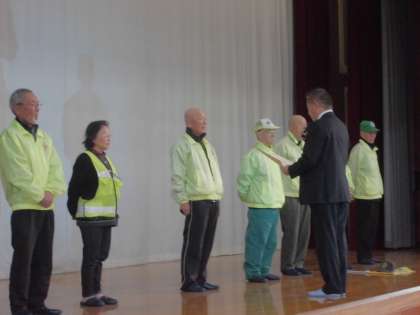 2月の朝会が行われました。朝会の初めに,毎日子ども達の登下校の様子を見守っていただいている「醍醐西こども見守り隊」の皆様に感謝状の贈呈式が行われました。
