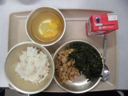 今日の給食の献立は,「麦ご飯」「ほうれん草とじゃこの炒めもの」「とりそぼろ丼の具」「牛乳」「フルーツ寒天」です。