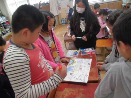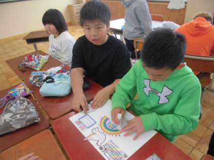 今日は最後のたてわり活動となる「レインボーお別れ給食」が行われました。まずは4時間目に,各グループ1〜5年生までが集まり,6年生に感謝の気持ちを伝えるメッセージカードを作りました。