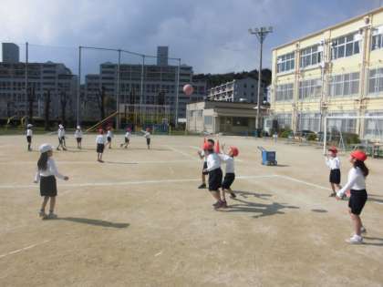 体育の時間に,「パスゲーム」を学習しています。今日は,パスの仕方について学習していました。