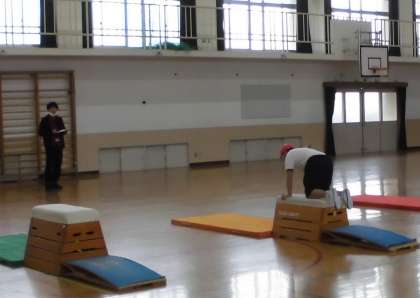4時間目の体育の交流は,跳び箱でした。技のテストを受けています。